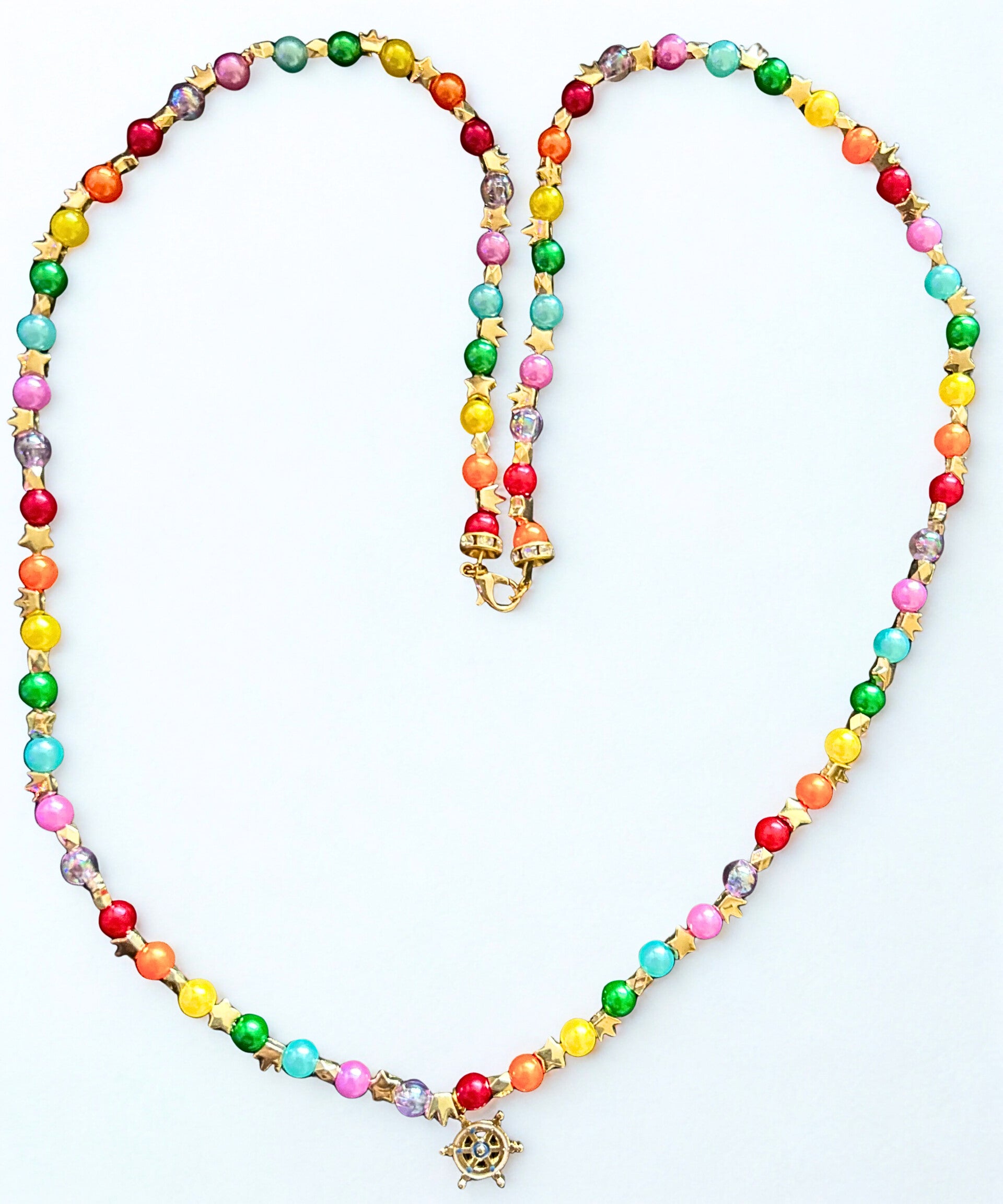 Embrace elegance with this hypoallergenic gold-plated helm necklace adorned with vibrant multi-coloured beads.
