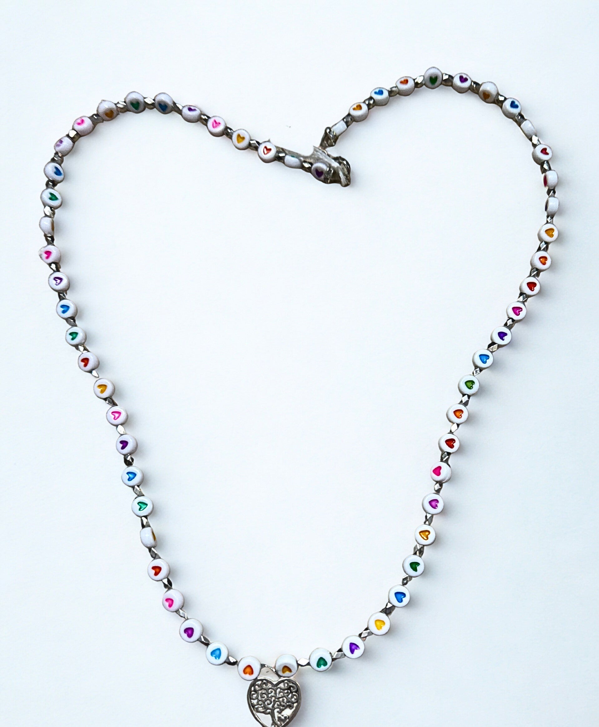 .Hypoallergenic Silver-plated white heart beaded necklace with tree of life heart charm
