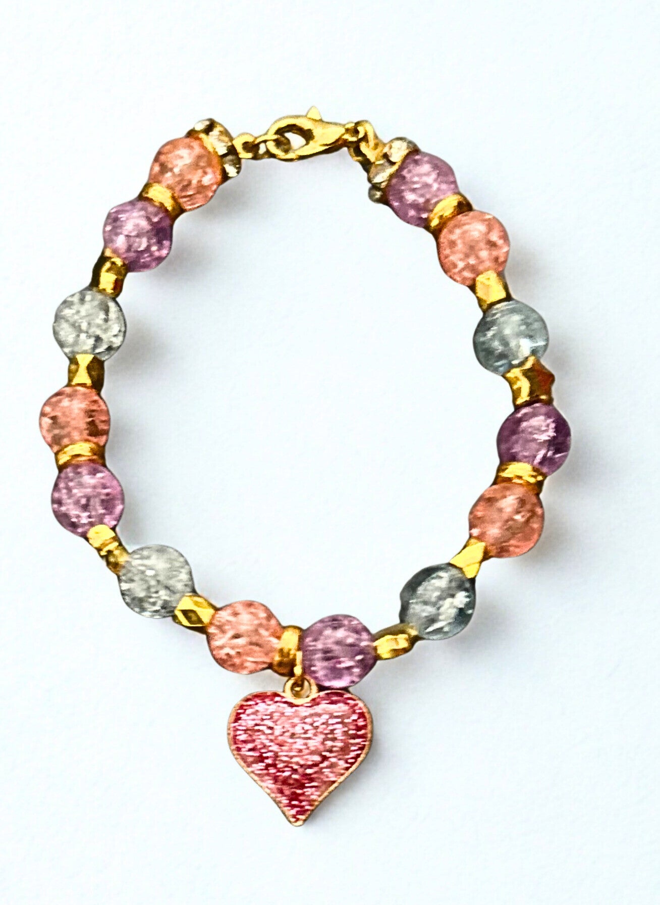 Hypoallergenic Gold-plated pink glittered heart bracelet with multi-pink beads