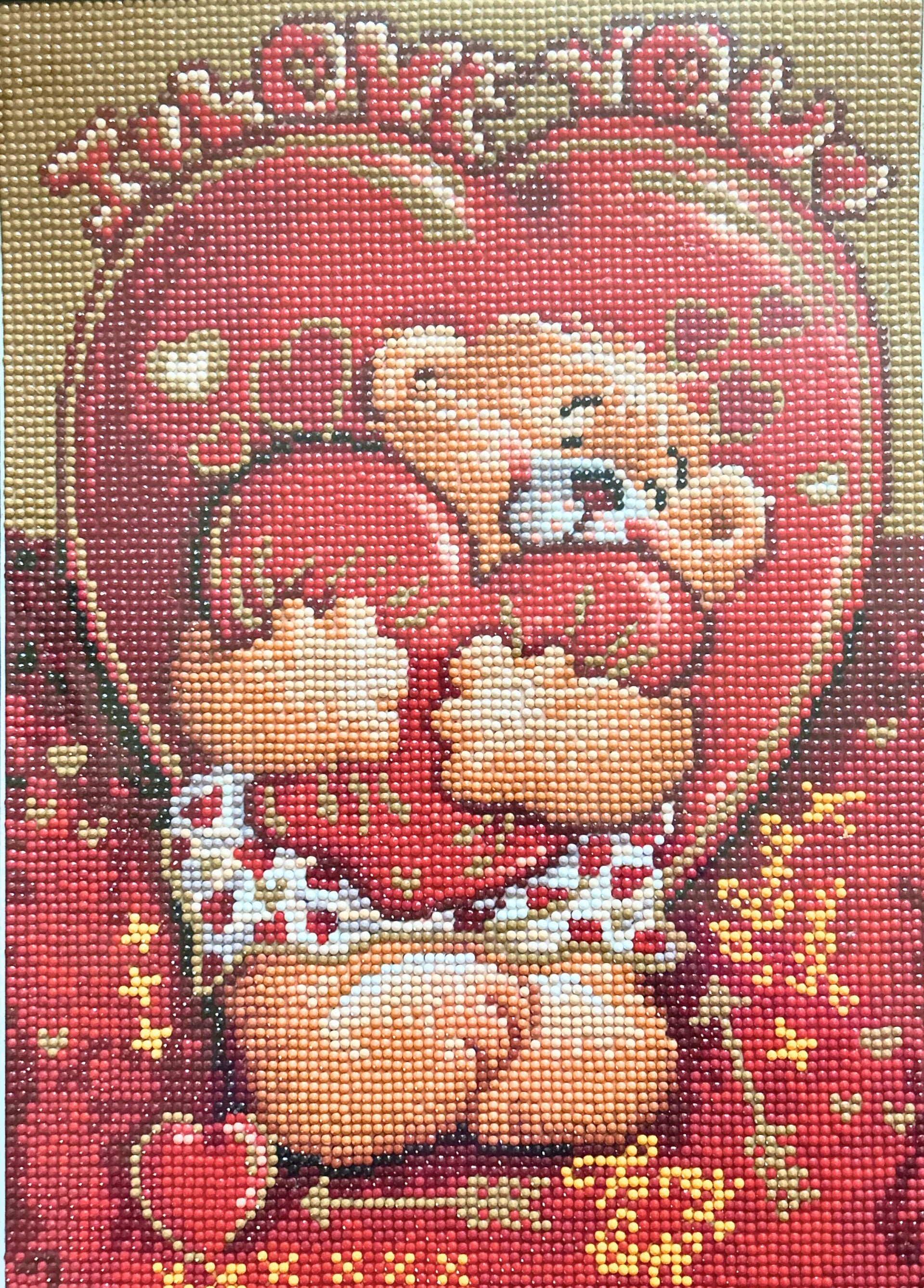 Bear love diamond painted picture completed and cured with a clear resign for 24 hours.
