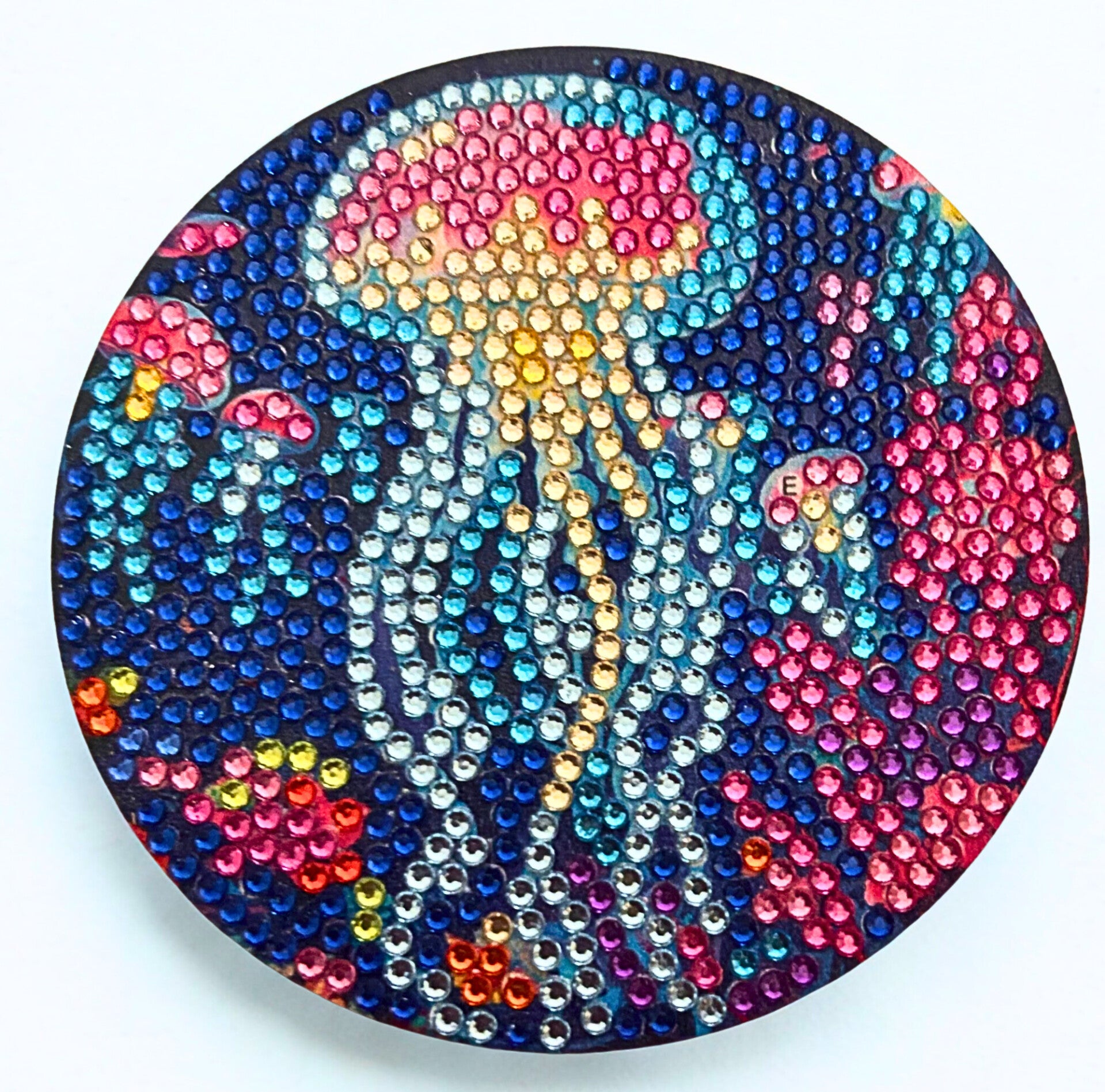 Diamond-painted set of 4 coasters with vibrant sea creatures including a octopus, starfish, otter and a jellyfish