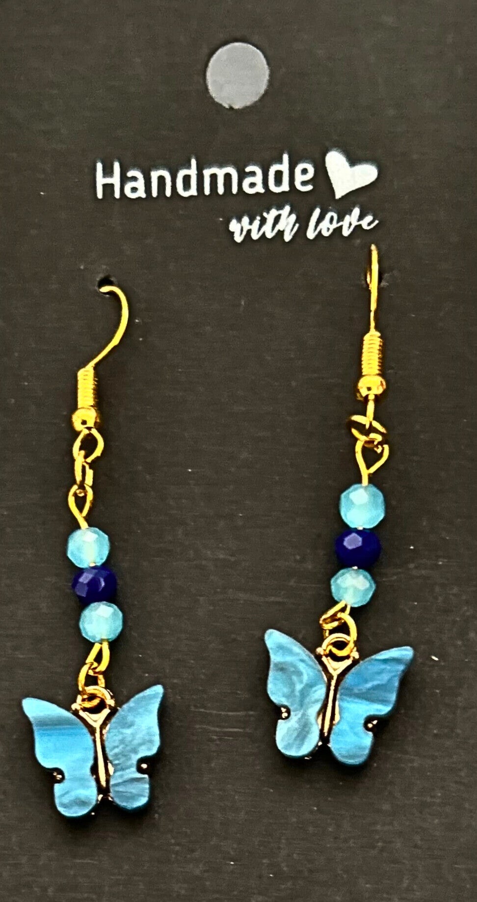 Gold-plated blue beaded earrings with blue butterfly charms